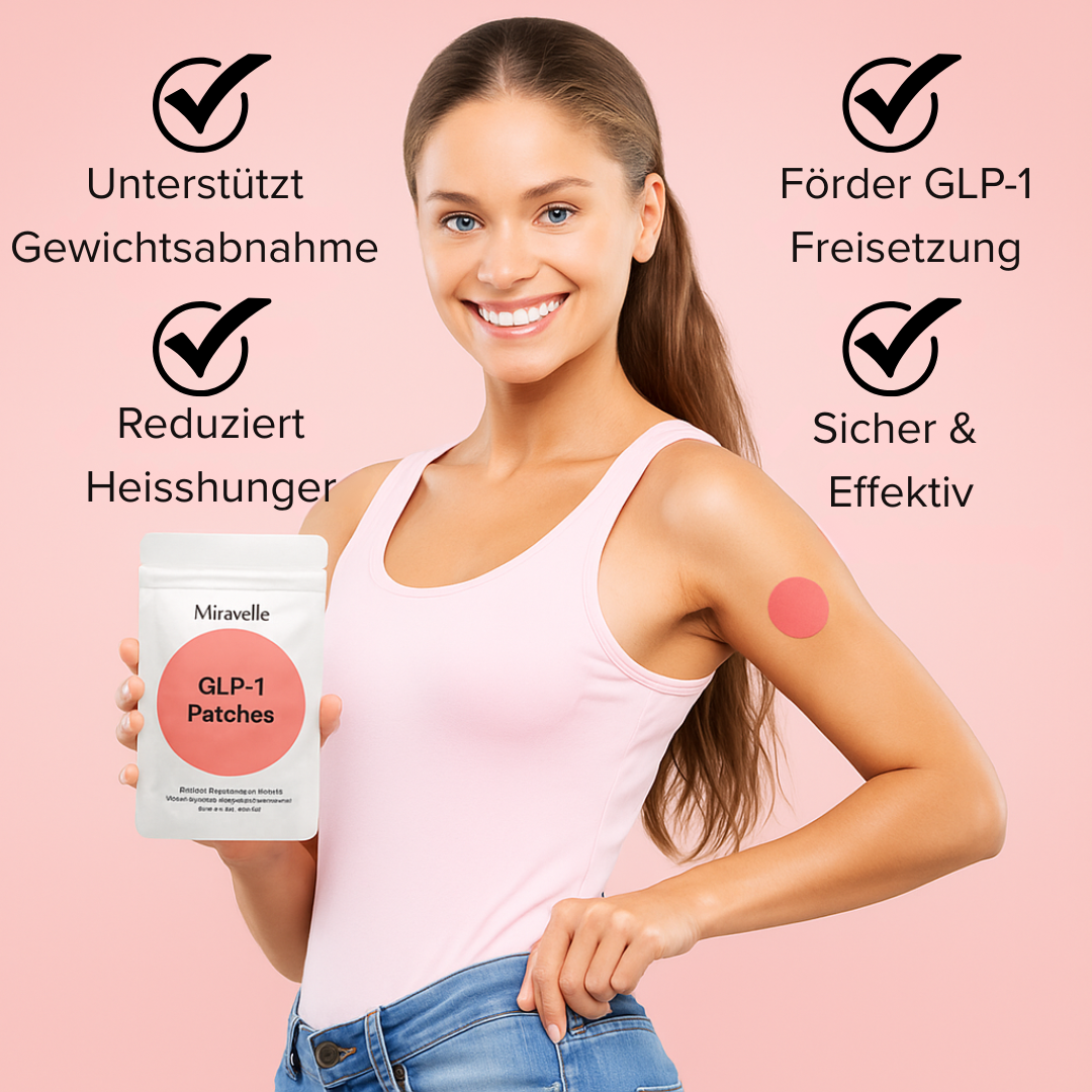 Die Miravelle GLP-1 Patches sind innovative Pflaster, die natürliche Wirkstoffe über die Haut abgeben. Sie unterstützen die GLP-1-Freisetzung, reduzieren Heißhunger und helfen dir so beim Abnehmen – ganz ohne Pillen oder Pulver.