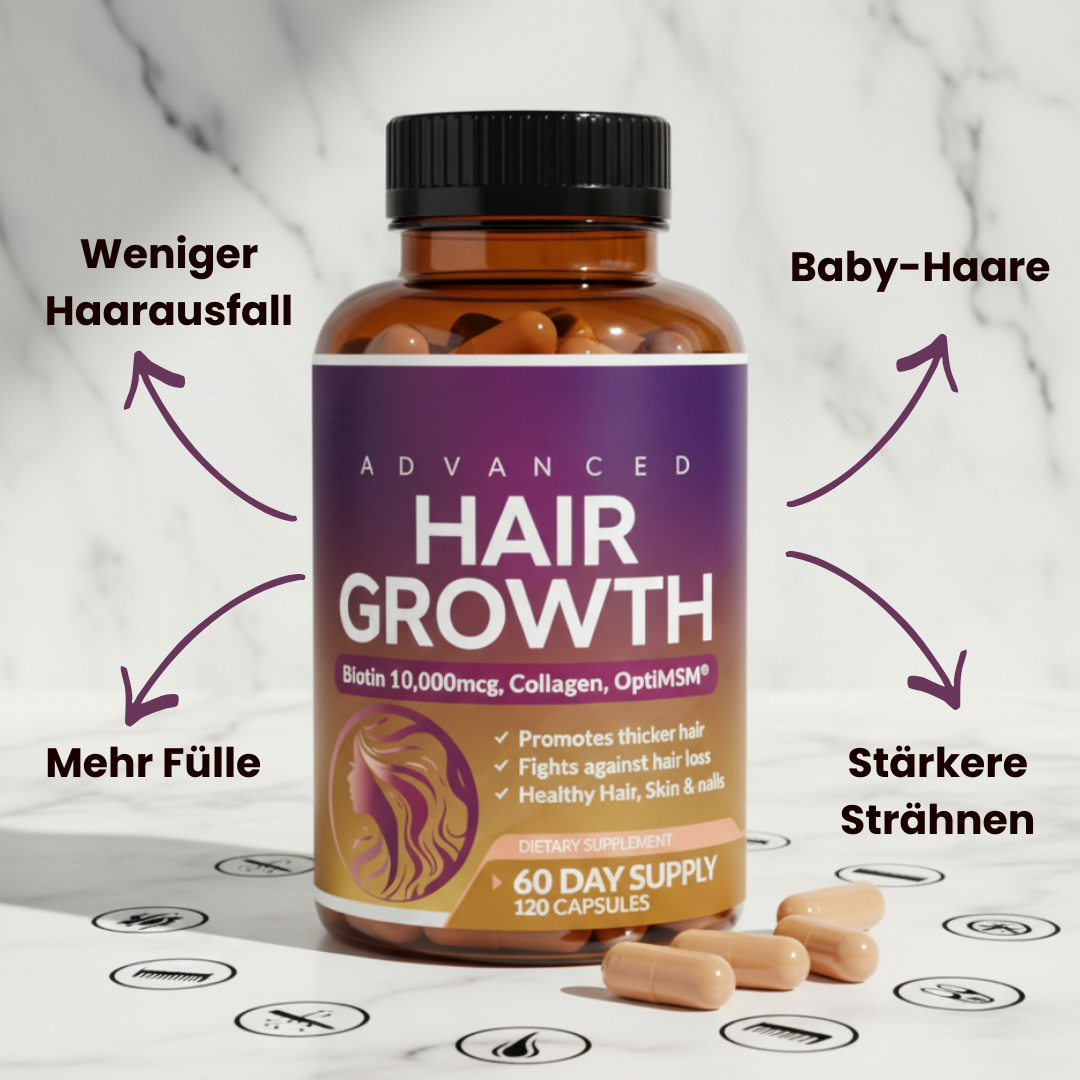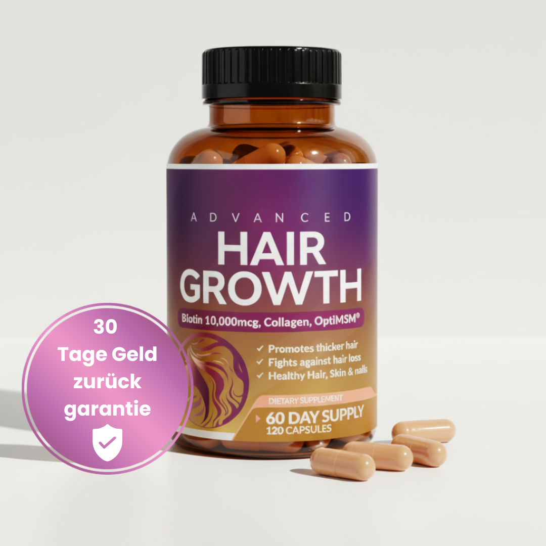 Teste unsere 24 in 1 Haarwuchs Kapseln 30 Tage lang. Wenn du kein dickeres, stärkeres, gesünderes Haar siehst – bekommst du dein Geld zurück. Keine Fragen. Kein Aufwand. Kein Risiko.