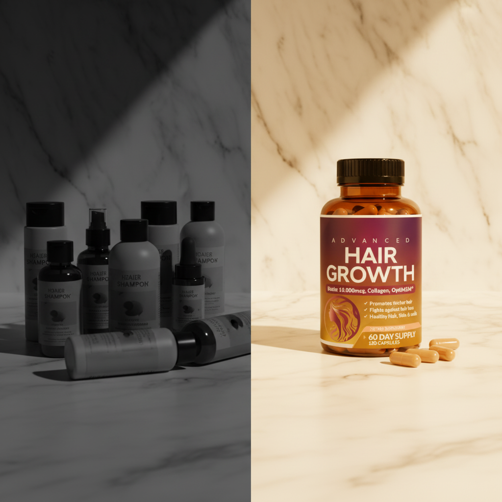 Anders als Shampoos und Seren, die nur die Oberfläche behandeln, wirken unsere 24 in 1 Haarwuchs Kapseln von innen heraus. Unsere Formel liefert 10'000mcg Biotin, Kollagen, OptiMSM® und 20+ Nährstoffe direkt an deine Haarfollikel – wo Haarwachstum wirklich beginnt. Nimm täglich 2 Kapseln und lass die Nährstoffe den Rest erledigen.