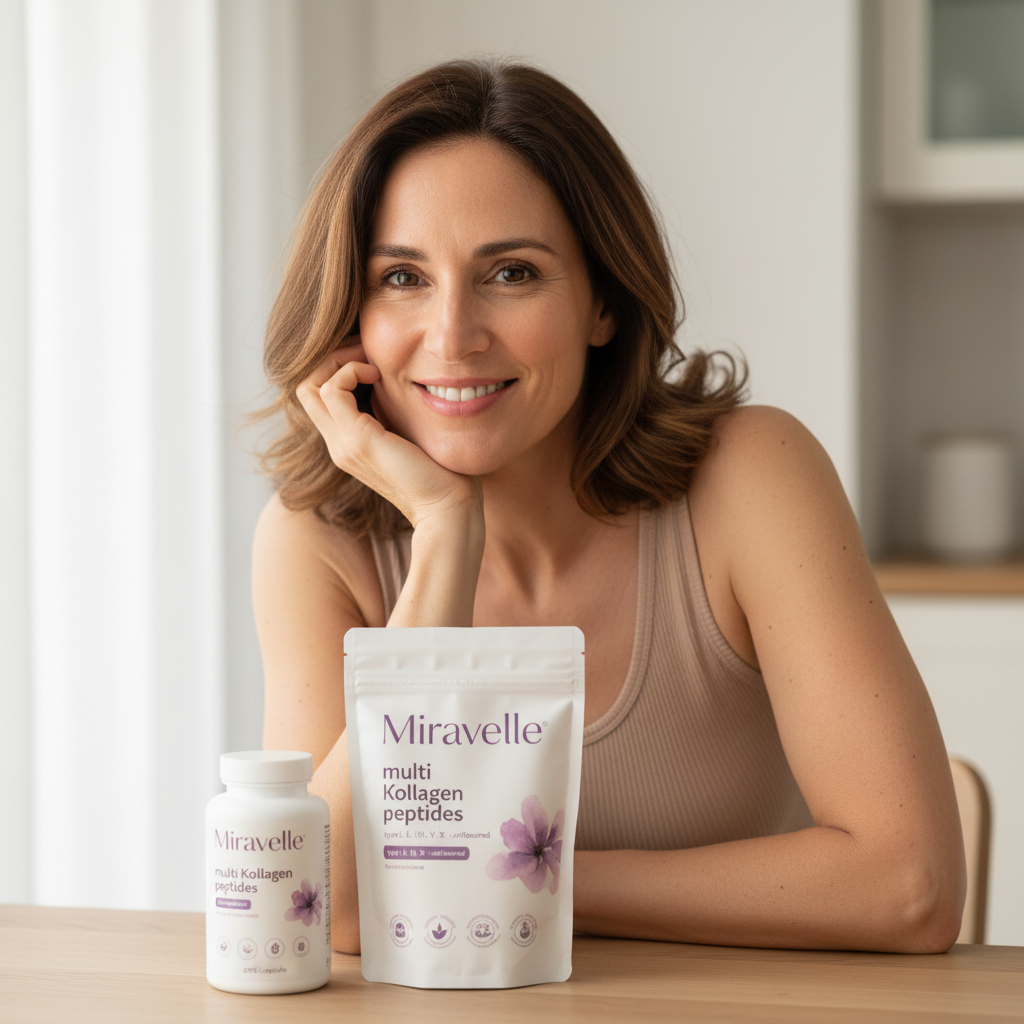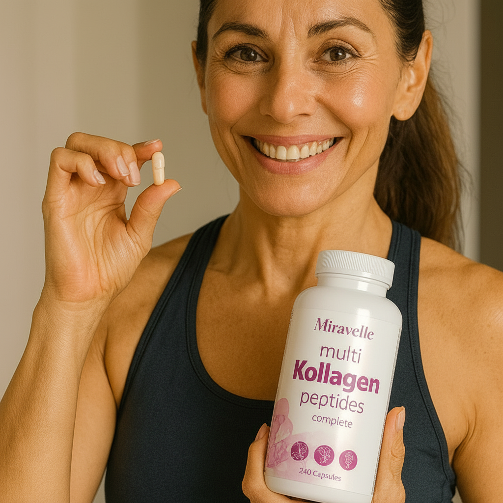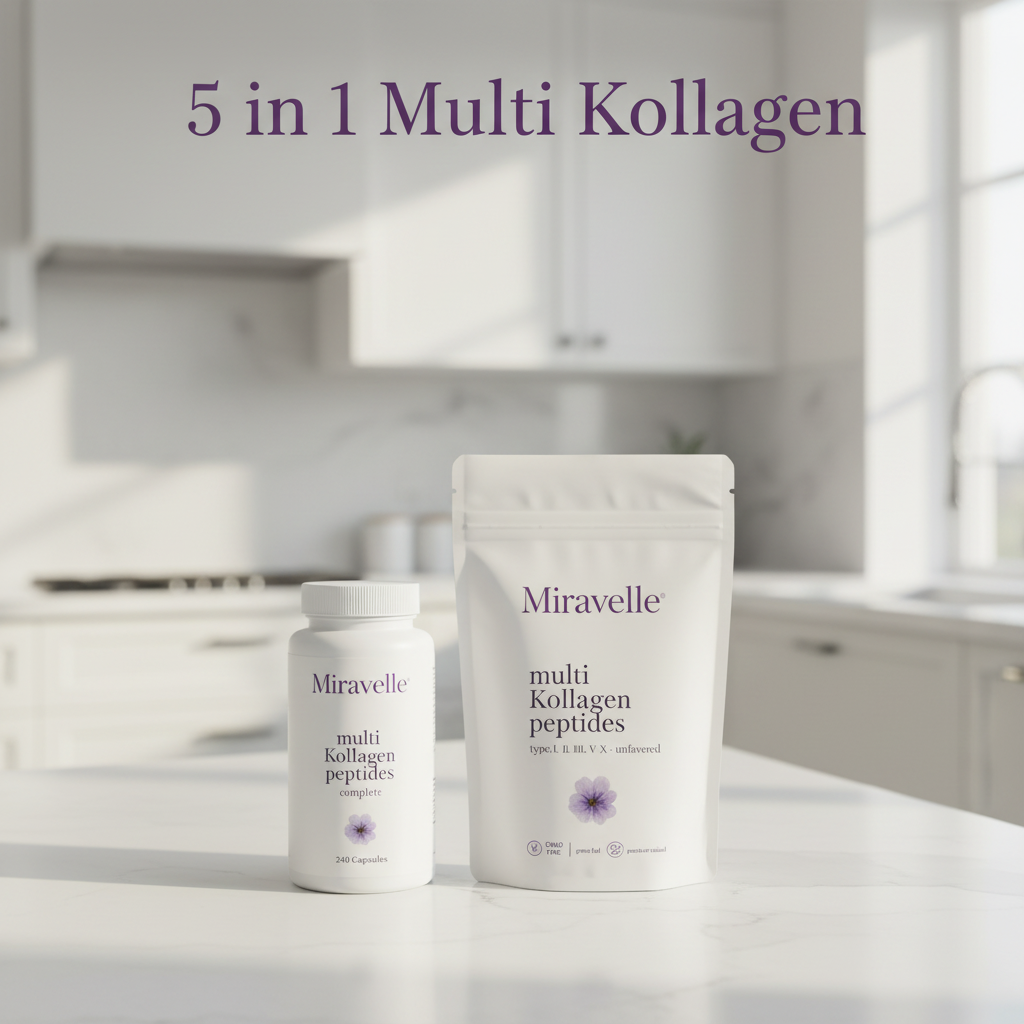 Multi Kollagen unterstützt deinen Körper mit 5 hochwirksamen Kollagen-Typen, Biotin, Vitamin C & Hyaluronsäure – für glatte, straffe und strahlende Haut von innen heraus.