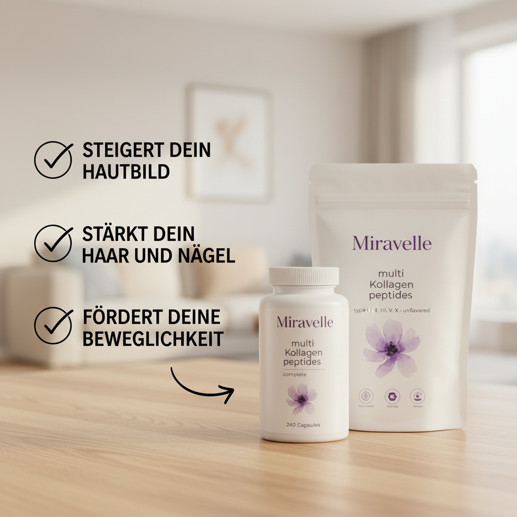 Die enthaltenen Kollagen-Peptide liefern deinem Körper die Bausteine, die er zur Regeneration von Haut, Bindegewebe, Haaren und Gelenken benötigt.